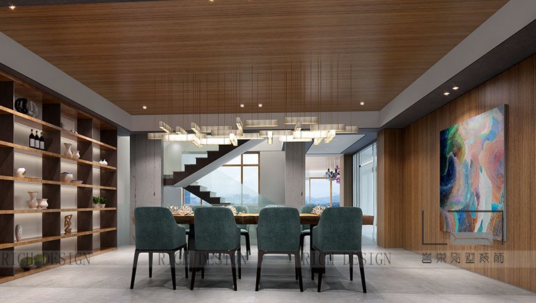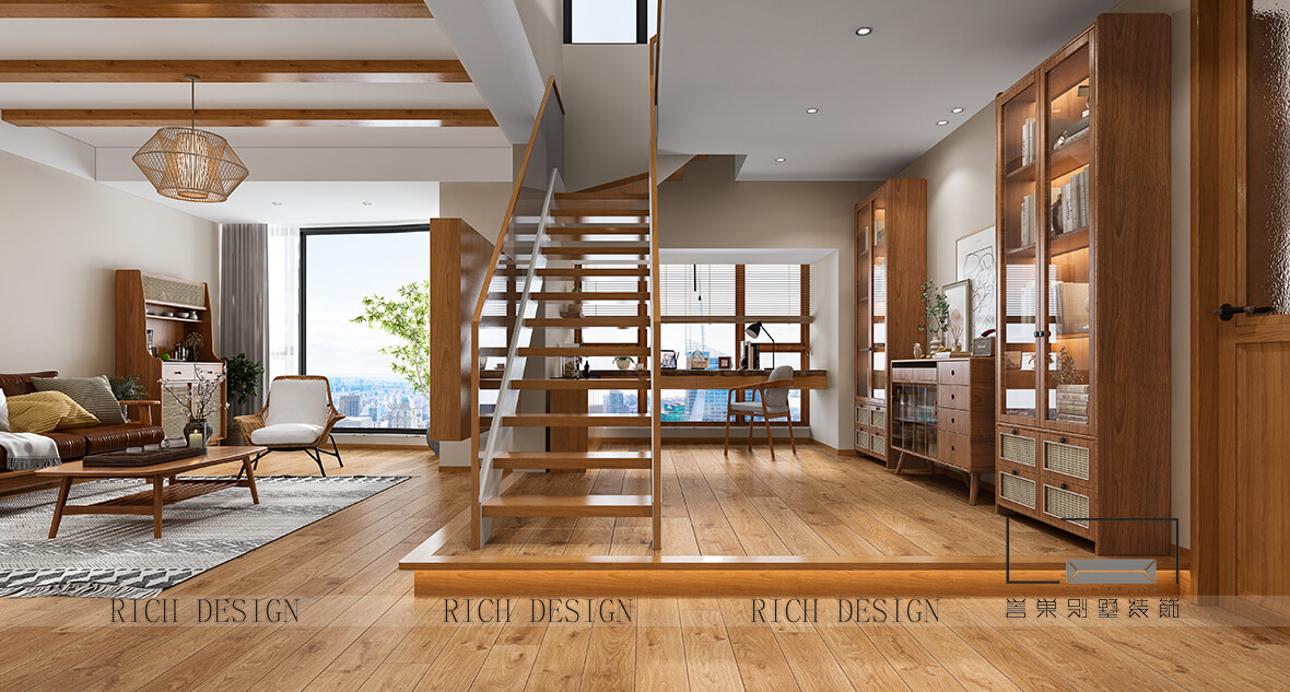 這是一套230m2頂樓復式,采用大塊面的原木色飾面板包裹住的房子,將客餐廳、臥室與書房,進行合理分區,組成一個個方形空間,仿佛置身于一個大木盒中。
